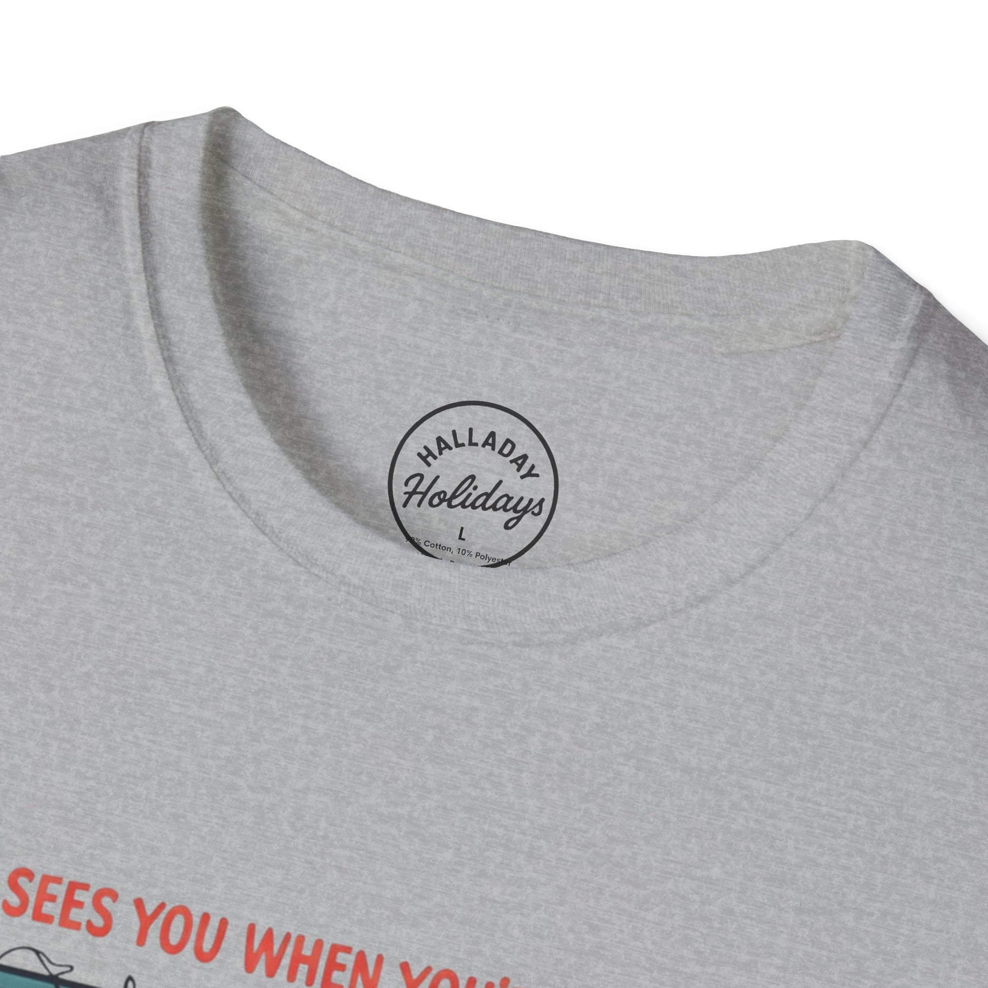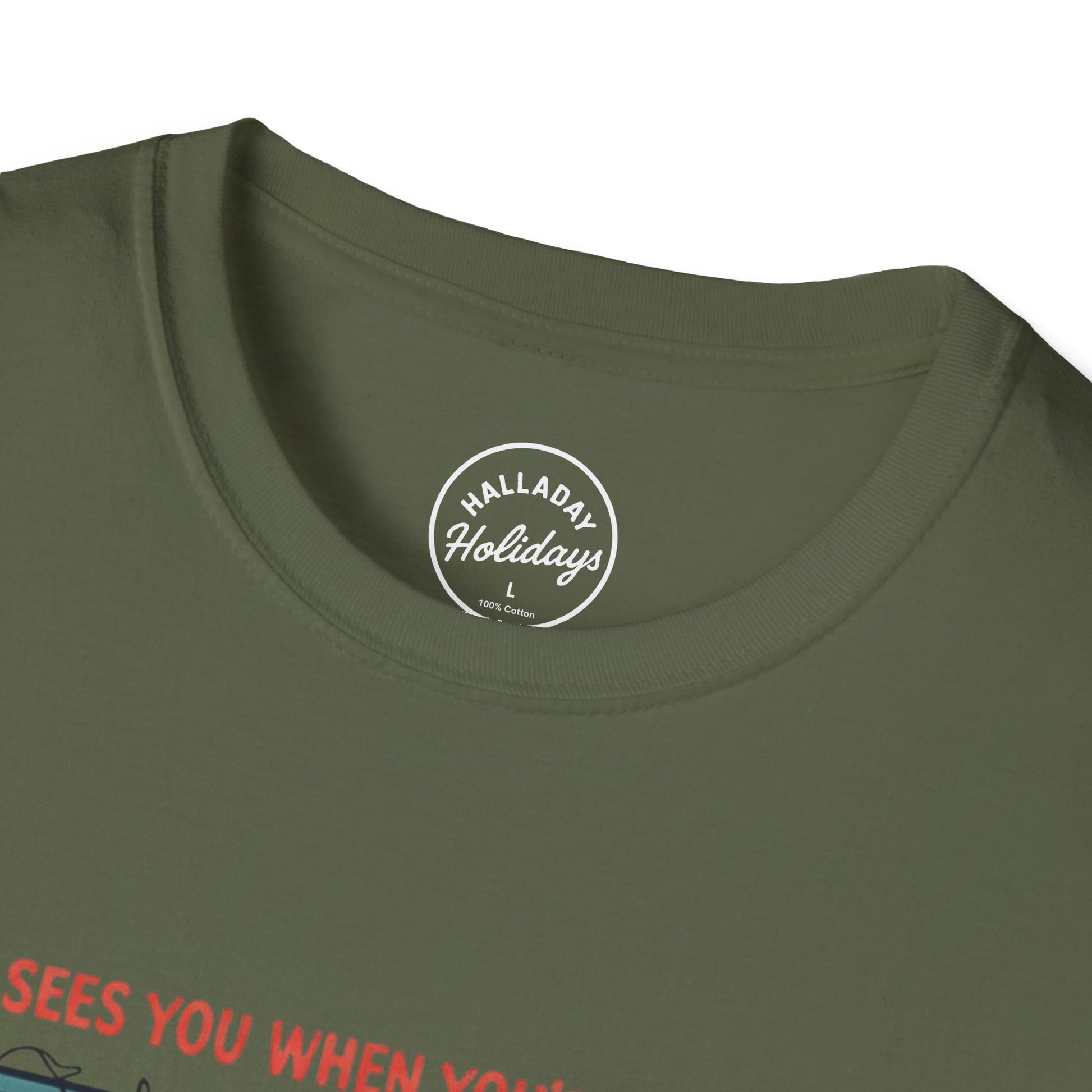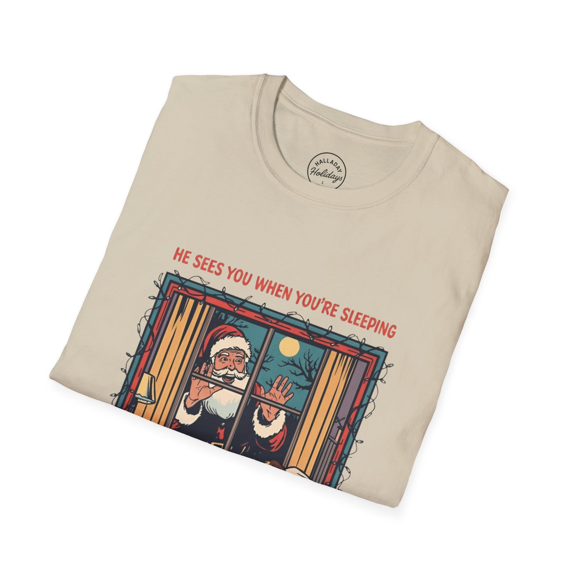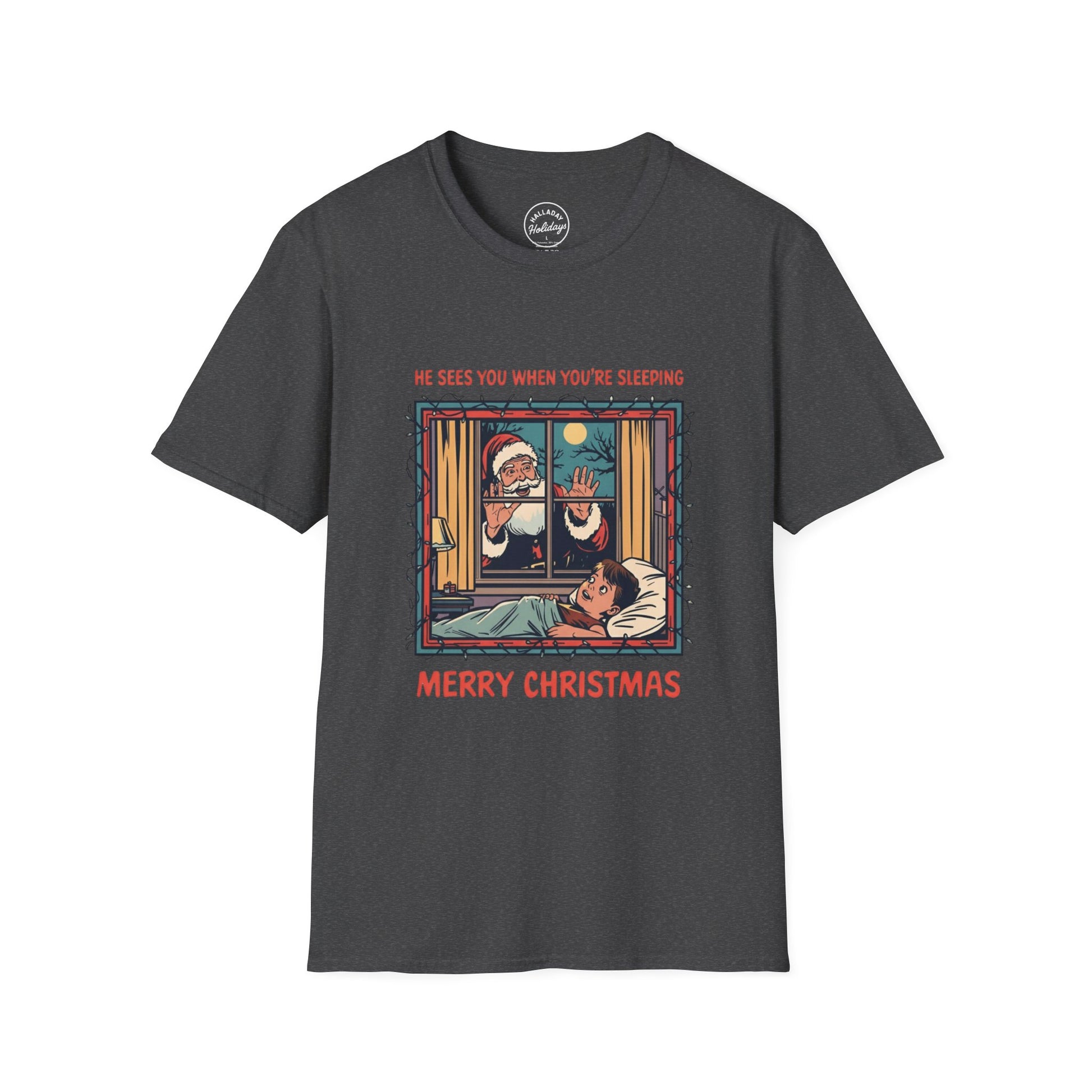 A funny and themed Christmas tee featuring the phrase 'he sees you when you're sleeping'. This T-shirt is perfect for adding a touch of humor to your holiday wardrobe. Ideal for adults looking for a festive and comic addition to their Christmas celebrations.
