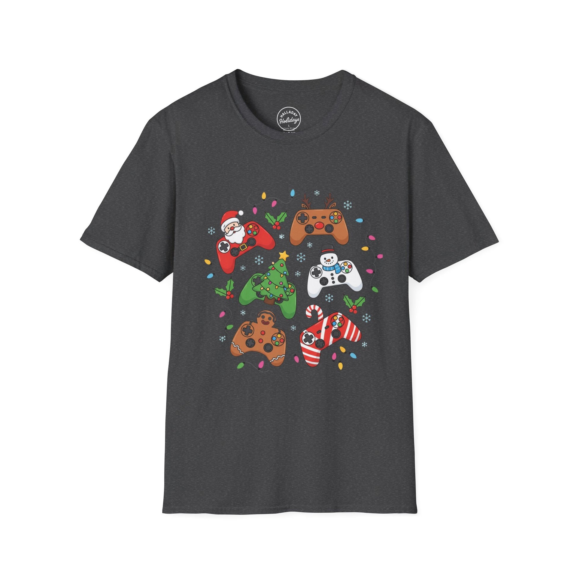 Fun Christmas shirt for gamers, perfect for adding a festive touch to their wardrobe. This unisex softstyle T-shirt is made from durable and smooth fabric, suitable for printing. It is ideal for adults and offers a classic fit with a crew neckline for versatile styling. Great for holiday gatherings and casual outings.