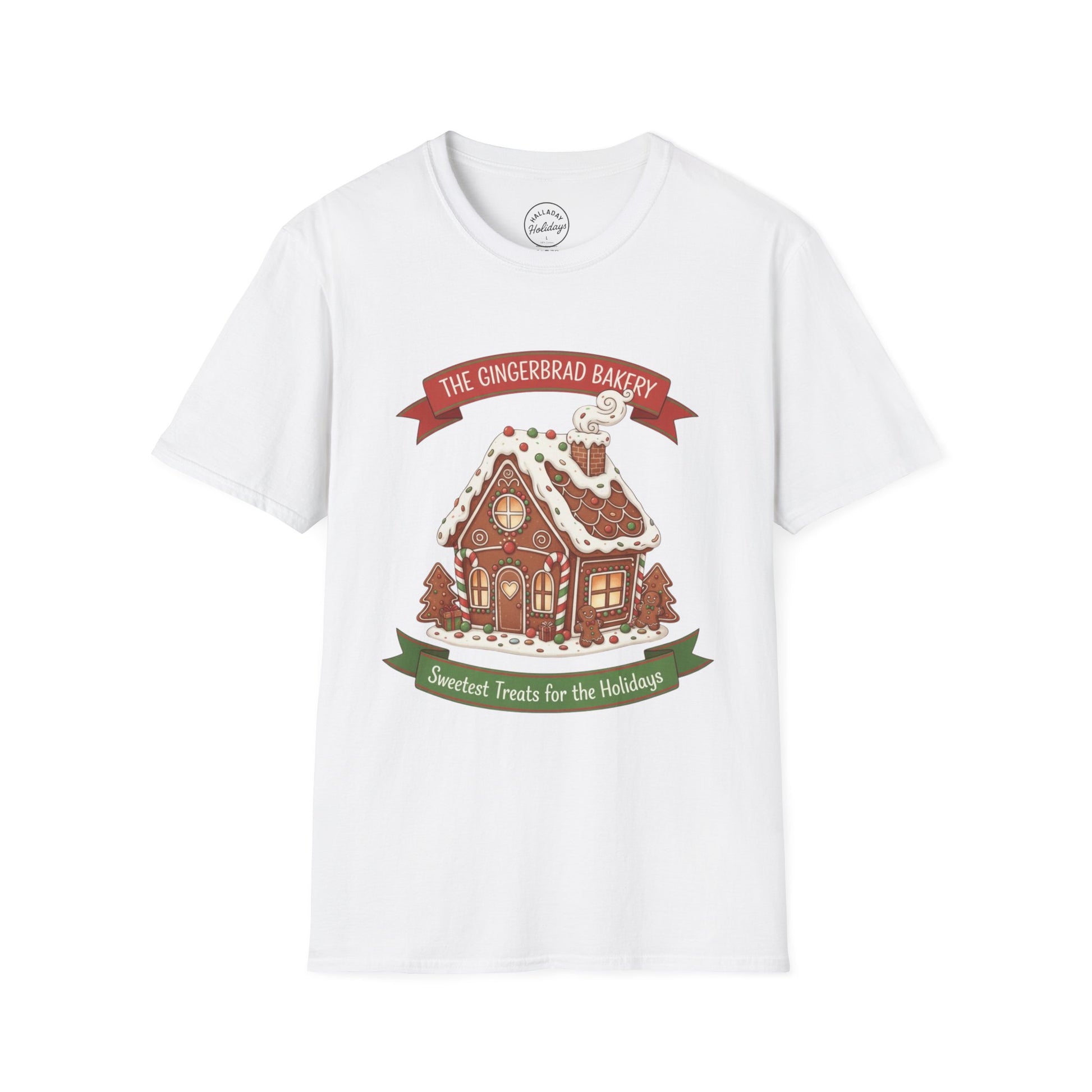 A cute gingerbread bakery Christmas tee perfect for spreading holiday cheer. This unisex softstyle T-shirt is made from durable and smooth fabric, designed with a ribbed knit collar and shoulder tape for stability. Ideal for adults looking for a festive addition to their holiday wardrobe.